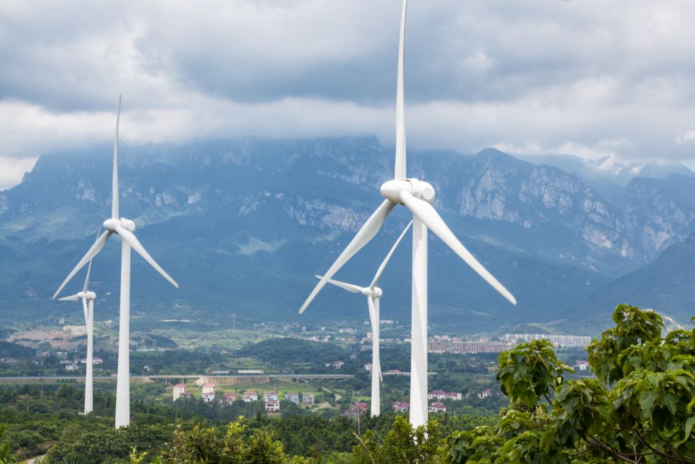Onshore wind farm established amidst mountainous terrain, utilizing natural wind patterns to generate renewable energy for the local grid, contributing to more sustainable power supply.
